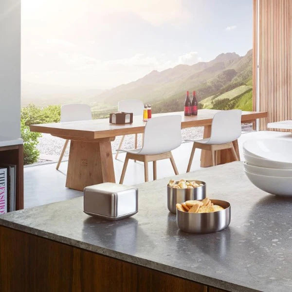 blomus stainless steel butter dish with double-insulated base comes is a classic, clean and simple butter dish suitable for the table. Butter dish includes stainless steel lid.