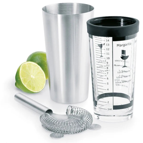 The blomus stainless steel boston cocktail shaker set includes measurements and recipes imprinted on the glass. Rubber edge protects the glass when put together with stainless while shaking. Serve directly in glass or use the included strainer to pour. Perfect accessory for any bar. The Boston Shaker Set comes with a stainless steel shaker, glass, and sieve. The glass shows several cocktail mixtures and their exact dosage.