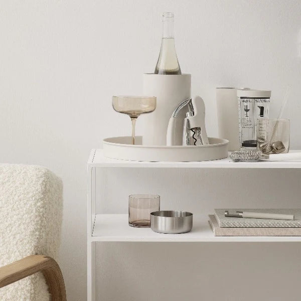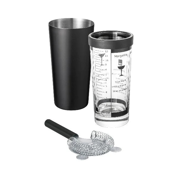 The blomus stainless steel boston cocktail shaker set includes measurements and recipes imprinted on the glass. Rubber edge protects the glass when put together with stainless while shaking. Serve directly in glass or use the included strainer to pour. Perfect accessory for any bar. The Boston Shaker Set comes with a stainless steel shaker, glass, and sieve. The glass shows several cocktail mixtures and their exact dosage.