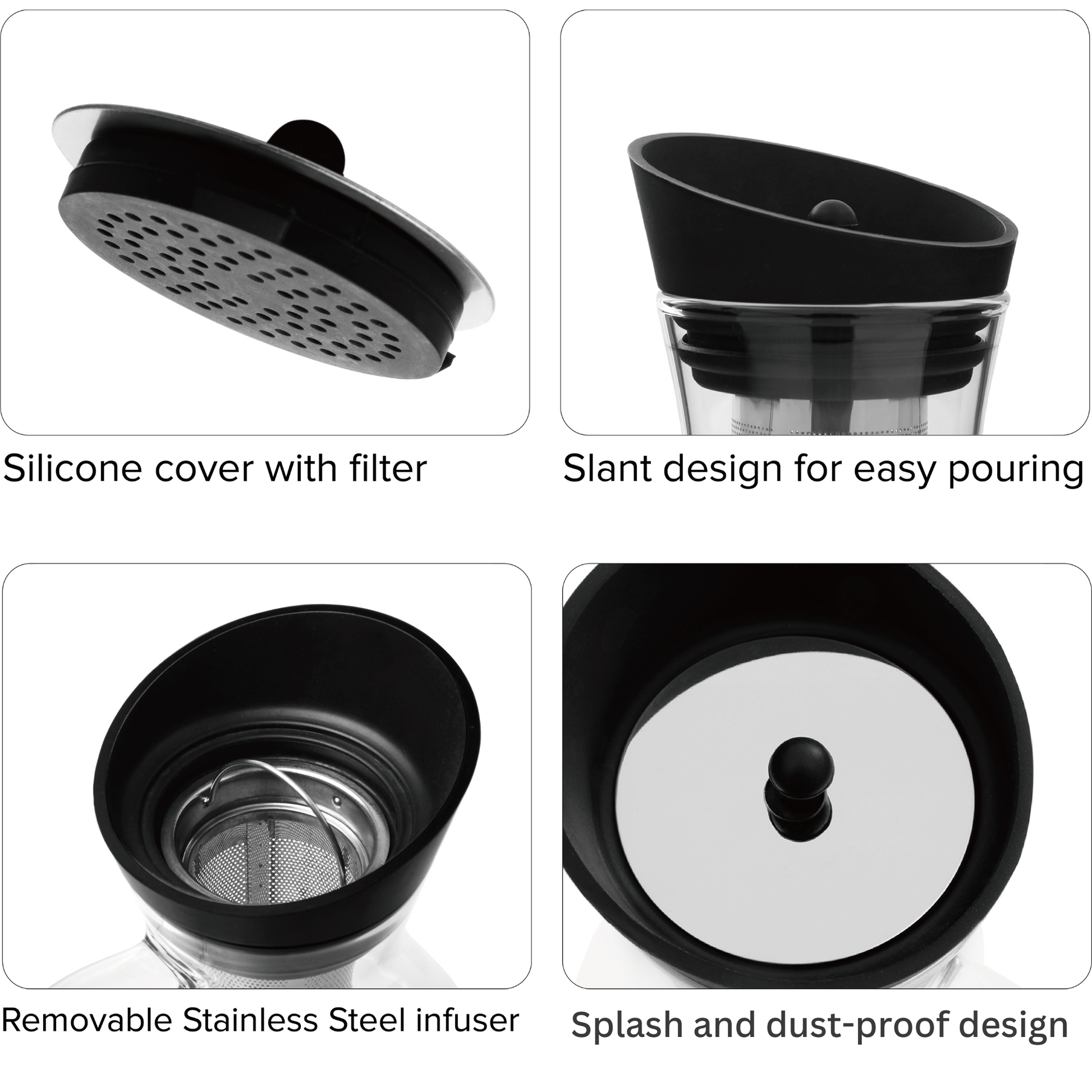 This large carafe will give you exquisitely brewed tea, time after time. The borosilicate glass is pleasantly cool to handle. The drip free silicone lid means you won’t waste a single drop and with the internal infuser, your loose-leaf tea will ripen in flavor as it brews to perfection.