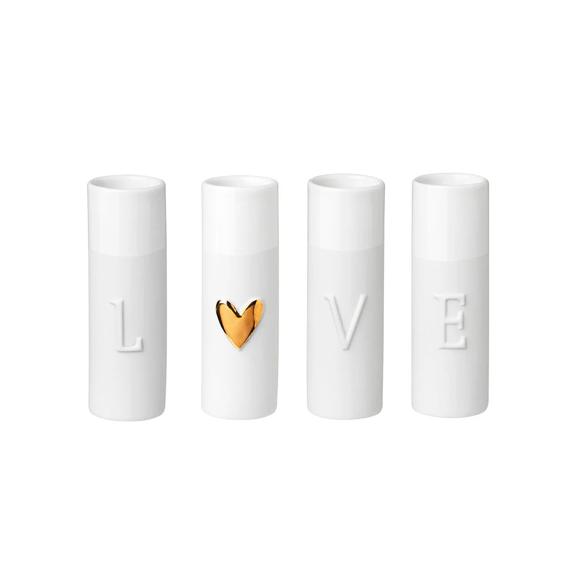 Love Mini Vases are little gifts for big feelings. Gifts that bring happiness and joy, love and friendship. Together the four Love Mini Vases spread the message of love in the form of matte porcelain letters with the international symbol of love: a shiny gold heart. Porcelain is both glazed and unglazed.