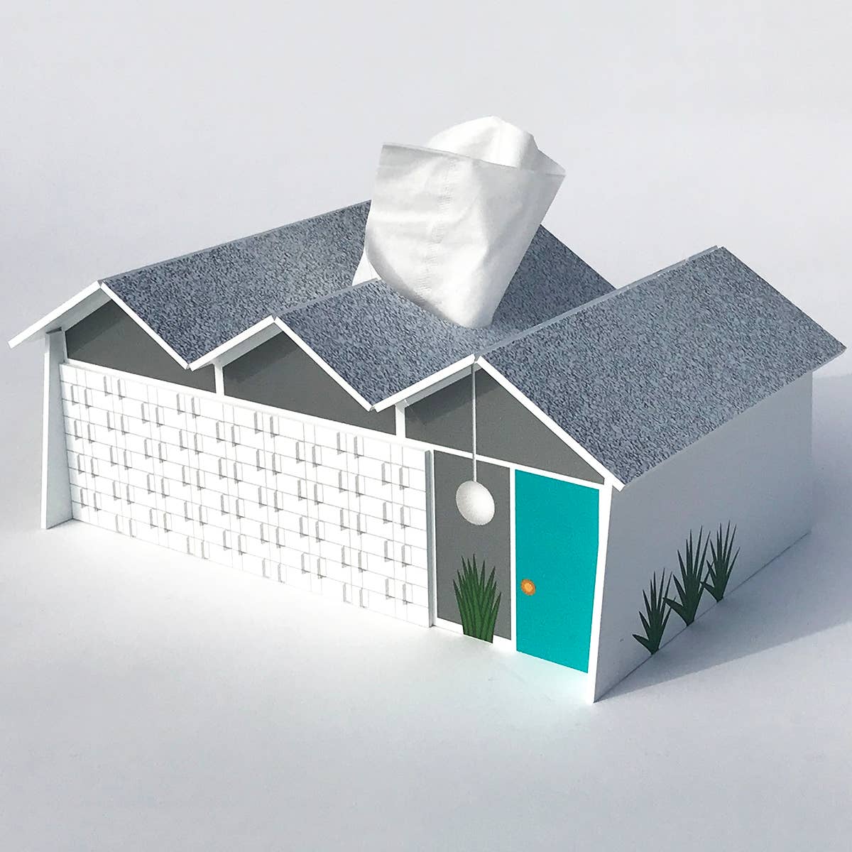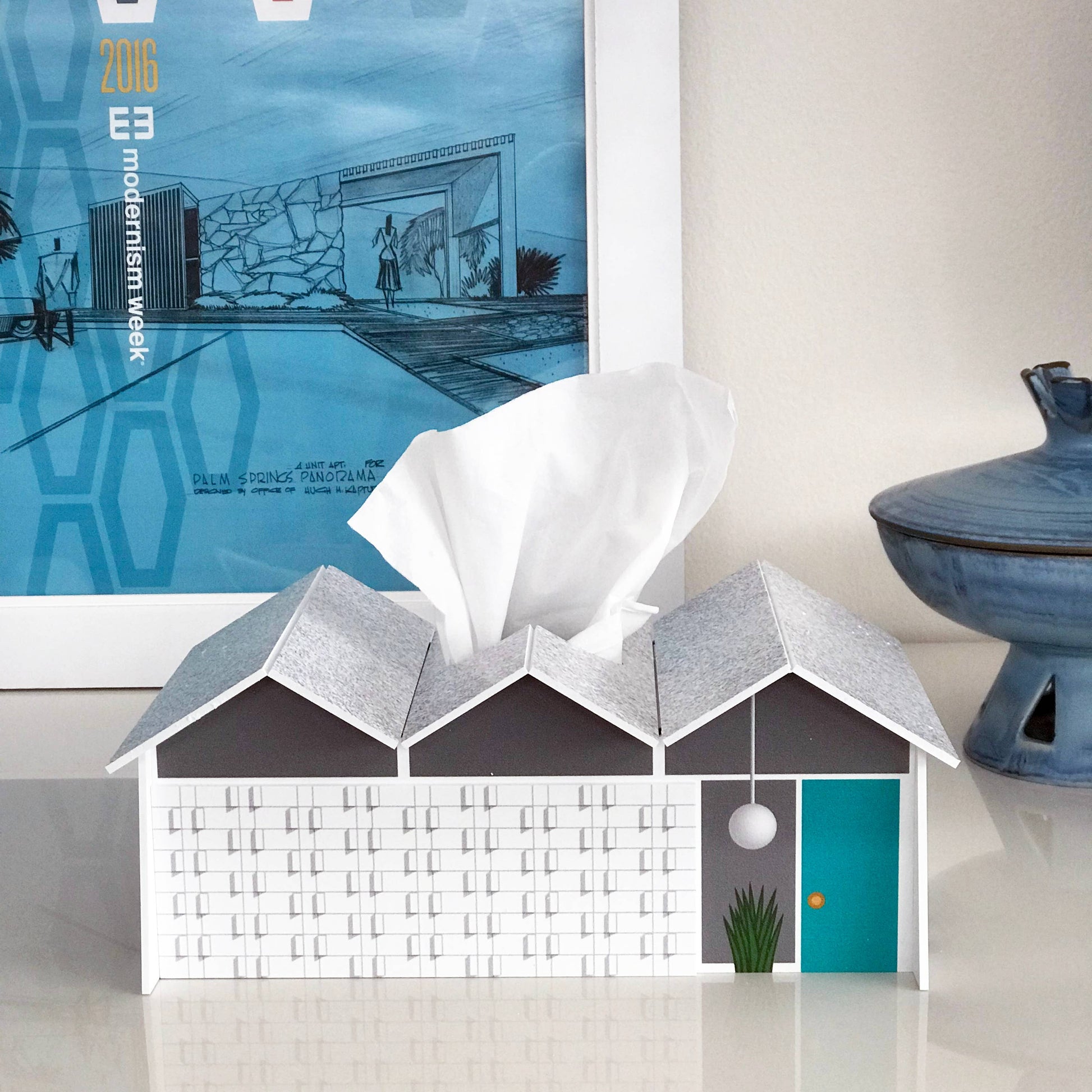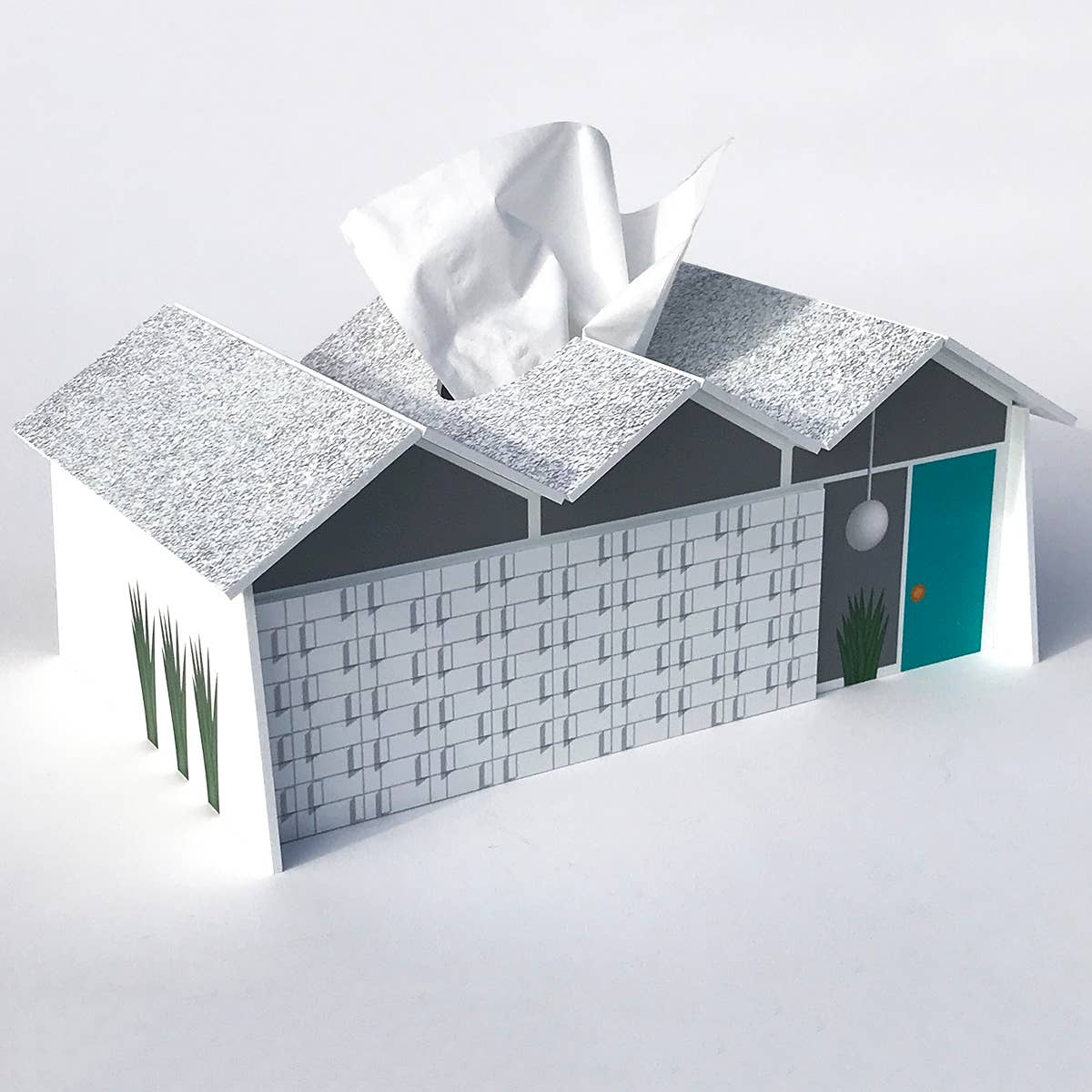 This original Destination PSP creation is a depiction of a classic mid-century modern home design found in Palm Springs, cleverly designed as a tissue box cover. The design is inspired by architect Barry Berkus's Park Imperial South and Merito Manor complexes of the 1960s.
