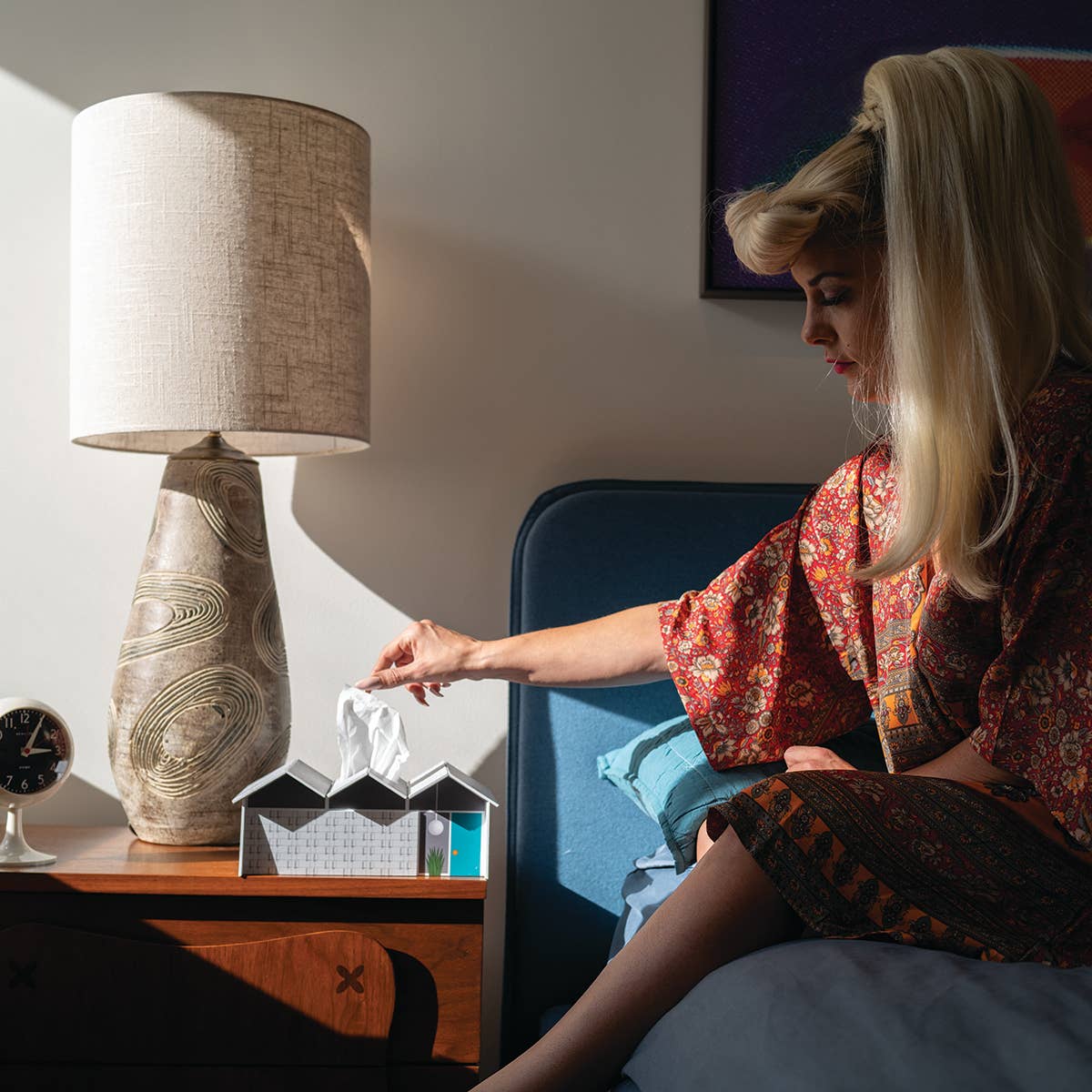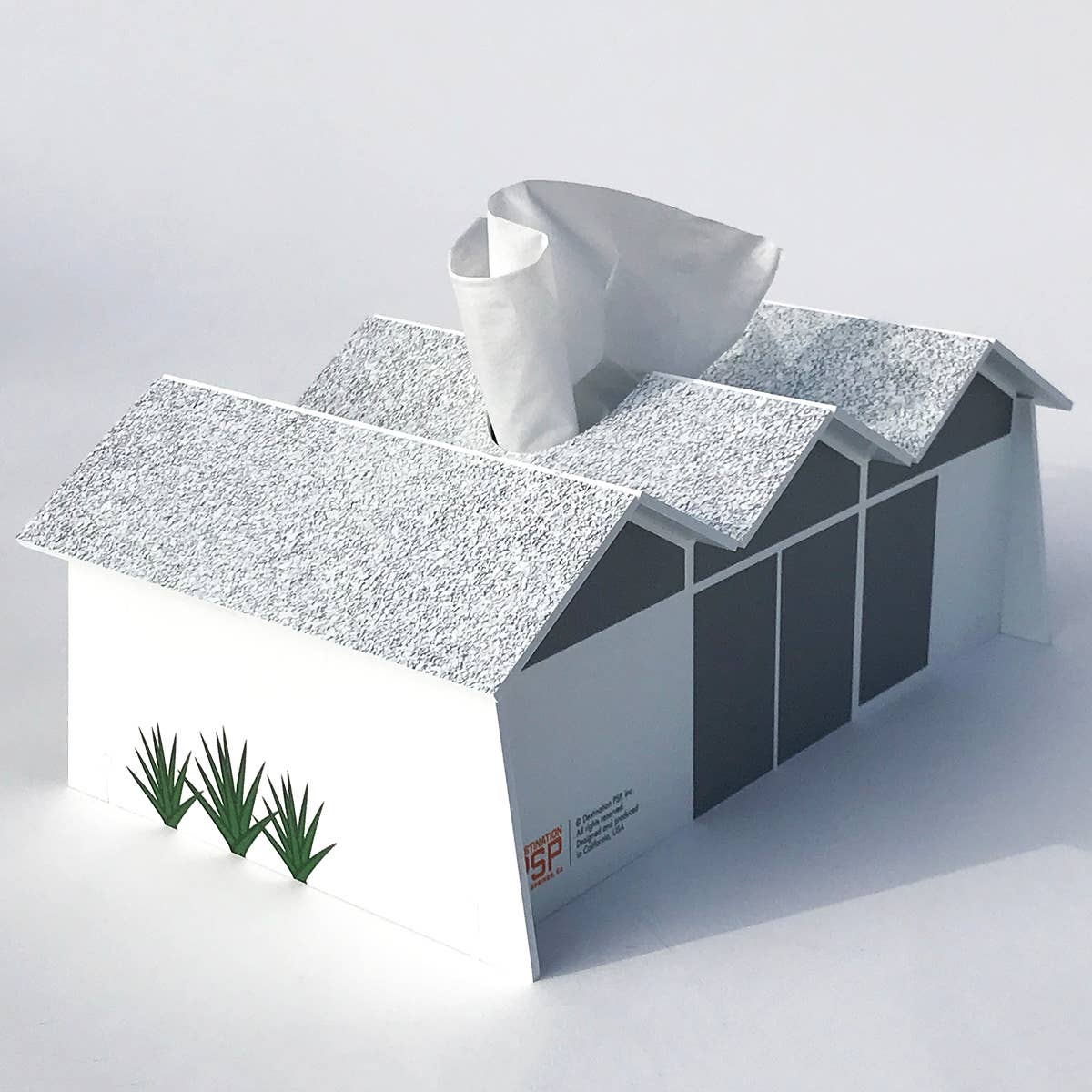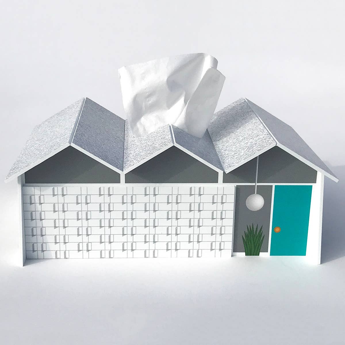 This original Destination PSP creation is a depiction of a classic mid-century modern home design found in Palm Springs, cleverly designed as a tissue box cover. The design is inspired by architect Barry Berkus's Park Imperial South and Merito Manor complexes of the 1960s.
