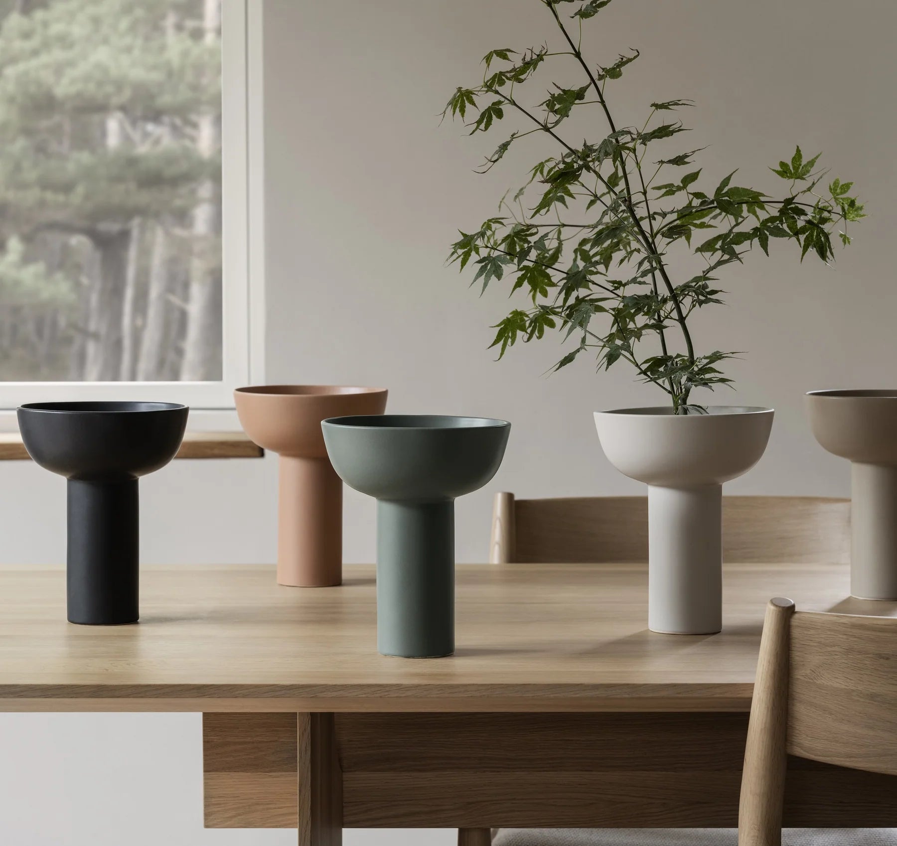 MIYABI Ceramic Vase, inspired by the Japanese art of ikebana - the gentle and mindful arranging of flowers into sculptural bouquets. The blomus vase is designed by Kazushige Miyake. MIYABI translates directly to elegance, grace or sophistication. What could be a more appropriate name for an ikebana vase? Ikebana considers not only the shapes, lengths and colors of the flowers and stems, but also the surface of the water, which is displayed in the wide top portion of the vase.