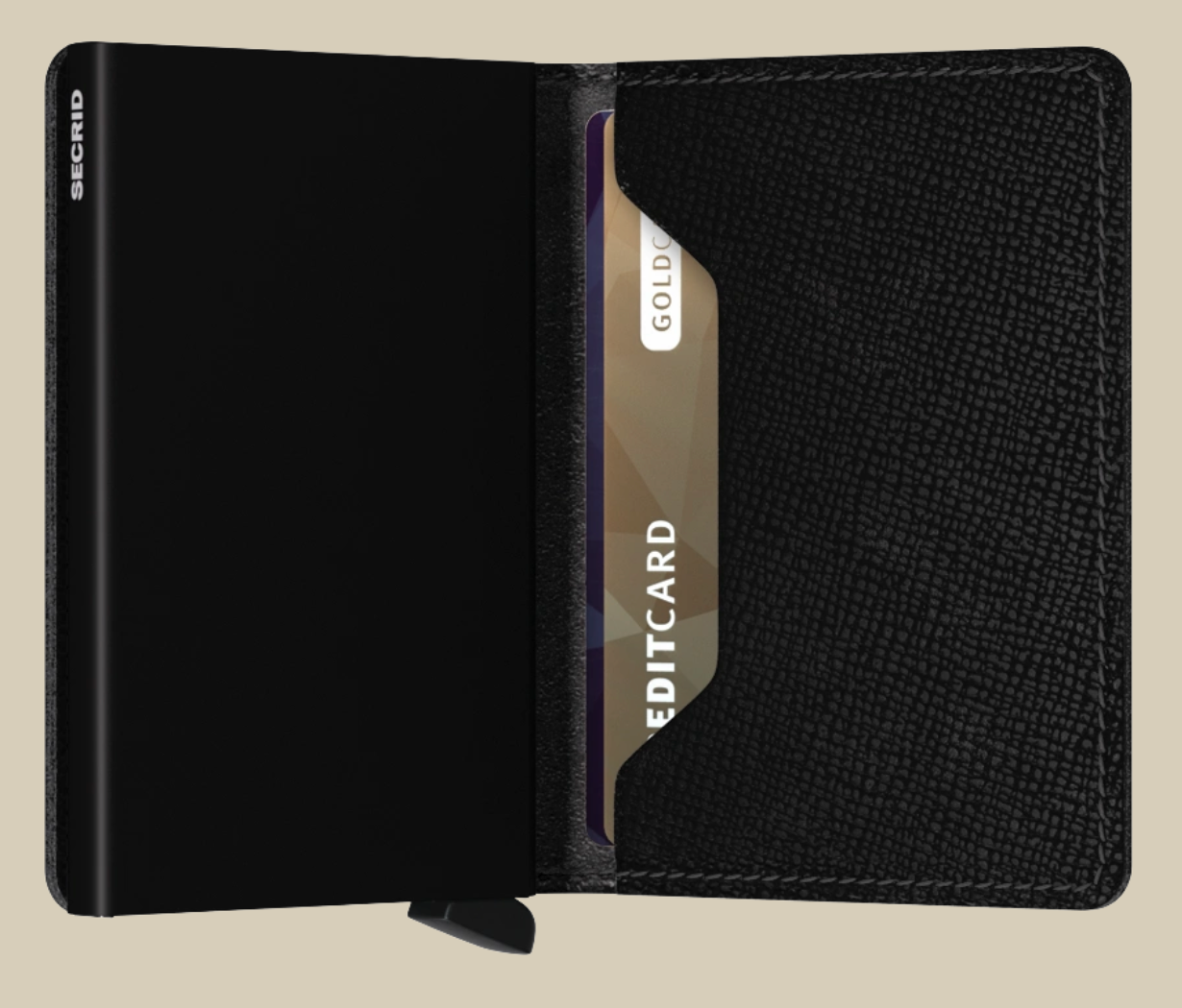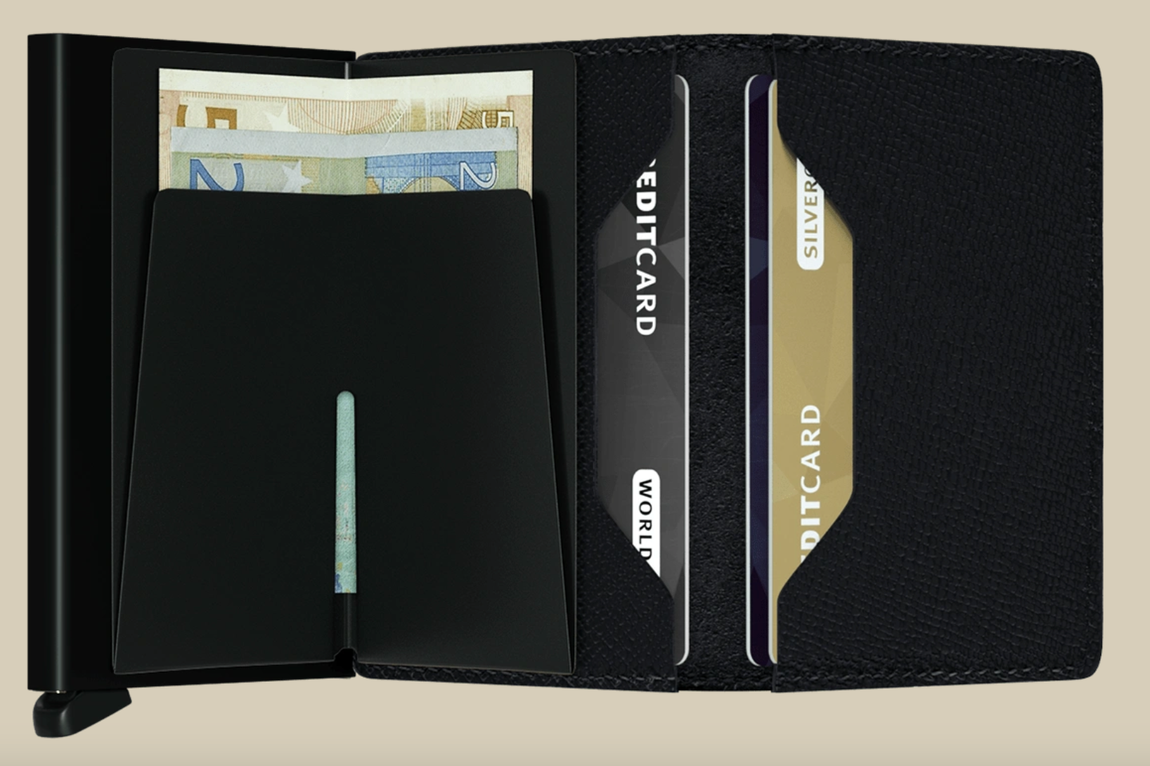 Its slim profile makes the Slimwallet fit perfectly into every pocket. The open exterior is cut extra wide to hold cards, banknotes and receipts. The Cardprotector mechanism allows you to slide out cards with one simple motion, while the aluminium protects your cards from bending, breaking and unwanted wireless communication.