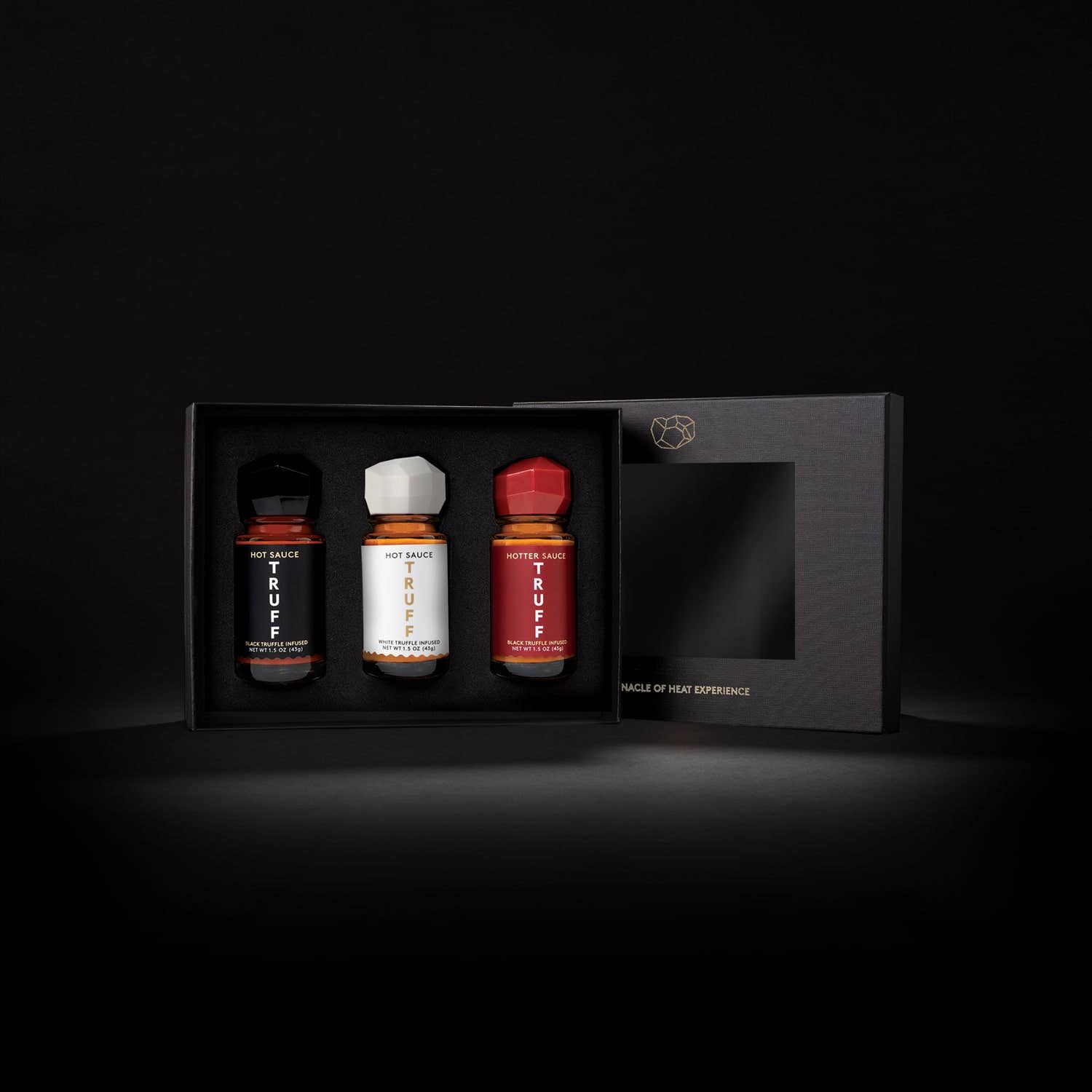 Introducing the Mini Variety Pack - an elegant presentation of the TRUFF Family in miniature! Original - a flavor forward truffle chili blend that packs a punch. The Hotter - a unique jalapeño rich blend designed for the heat seeking flavor connoisseur. White TRUFF Hot Sauce - a curated blend of ripe chili peppers, agave nectar, white truffle, and a hint of coriander. Assorted beautifully into a matte black and gold foil gift box.