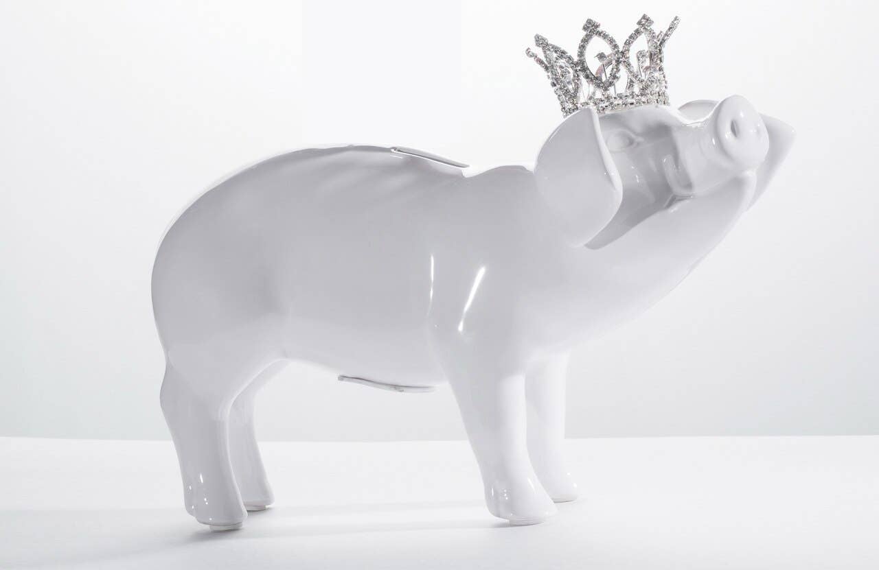 Subtlety suites anyone. This famous cutie is timeless. Take home a classic piggy bank with a style worth the times, and will never dull. A bold white gloss, complimented by a cute tiara, rounds off a simple, yet compelling design.